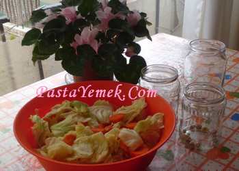 Süre sonunda kabın içindeki doğranmış turşuluk sebzeleri uygun büyüklükteki turşuluk kavanozlara hava kalmaması için bastırıp sıkıştırarak dolduruyoruz. Aralara sarımsak koymayı unutmuyoruz.